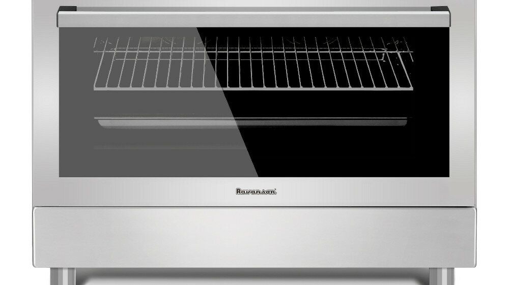 Кухня RAVANSON KWGE-K90-6 TOP CHEFF має подвійне скло в дверцятах духовки, освітлення, термостат, решітку, металеві напрямні та глибоке деко.