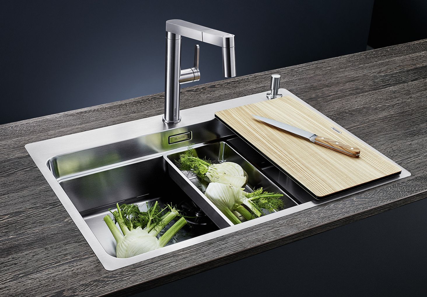 Простора, багатофункціональна, двоярусна чаша, що створює практичний центр раковини. Вбудований край створює додаткову робочу зону. Інноваційна системна концепція з напрямними ETAGON для універсального використання. Чаша оснащена C-подібним переливом і зливною системою BLANCO InFino - елегантна та проста в очищенні< /p>