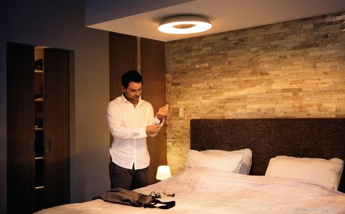 Використовуючи мобільний додаток Philips Hue (доступний для iOS та Android), ви можете дистанційно керувати освітленням з будь-якого місця. Перебуваючи поза домом, ви можете в будь-який момент перевірити, чи вимкнули ви світло, і легко увімкнути його знову. Для дистанційного керування освітленням потрібен міст Philips Hue.
