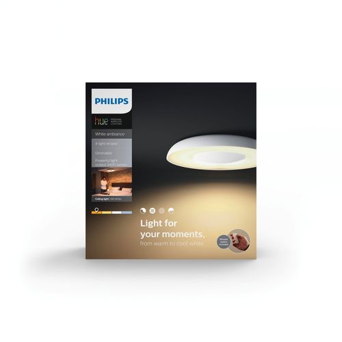 Елегантний дизайн, який підходить до будь-якого інтер'єру від світанку до заходу. Стельовий світильник Still (білого кольору) із вбудованим світлодіодним джерелом світла забезпечує широкий діапазон білого світла (від холодного до теплого білого. Підберіть біле світло до поточної діяльності та легко керуйте світлом за допомогою бездротового диммера, що входить у комплект. Можна під’єднати до інтелектуальної системи освітлення Philips Hue.