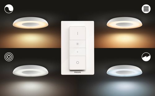 Диммер Philips Hue з батарейним живленням дозволяє легко керувати джерелами білого світла для навколишнього освітлення. Перемикання між 4 рівнями інтенсивності освітлення просте та здійснюється одним натисканням кнопки. Контролер диммера можна розмістити в будь-якому місці кімнати завдяки маленькій елегантній док-станції, а сам пристрій не потребує жодних кабелів. Використовуйте його як пульт дистанційного керування або повісьте на стіну, щоб насолоджуватися світловою сценою, яка підходить для будь-якого часу доби. Один диммер може контролювати до 10 точок світла Hue.