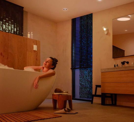 Водостійке інтелектуальне освітлення для ванних кімнат. Усі продукти, призначені для освітлення ванних кімнат, мають ступінь герметичності IP44, що означає, що вони придатні для використання у вологих приміщеннях.