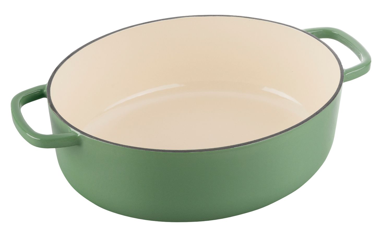 Каструля чавунна овальна, зеленого кольору та місткості. 5,5 л. Добре зберігає тепло і рівномірно розподіляє тепло. Комплектується кришкою зі спеціальною структурою. Покритий емаллю.