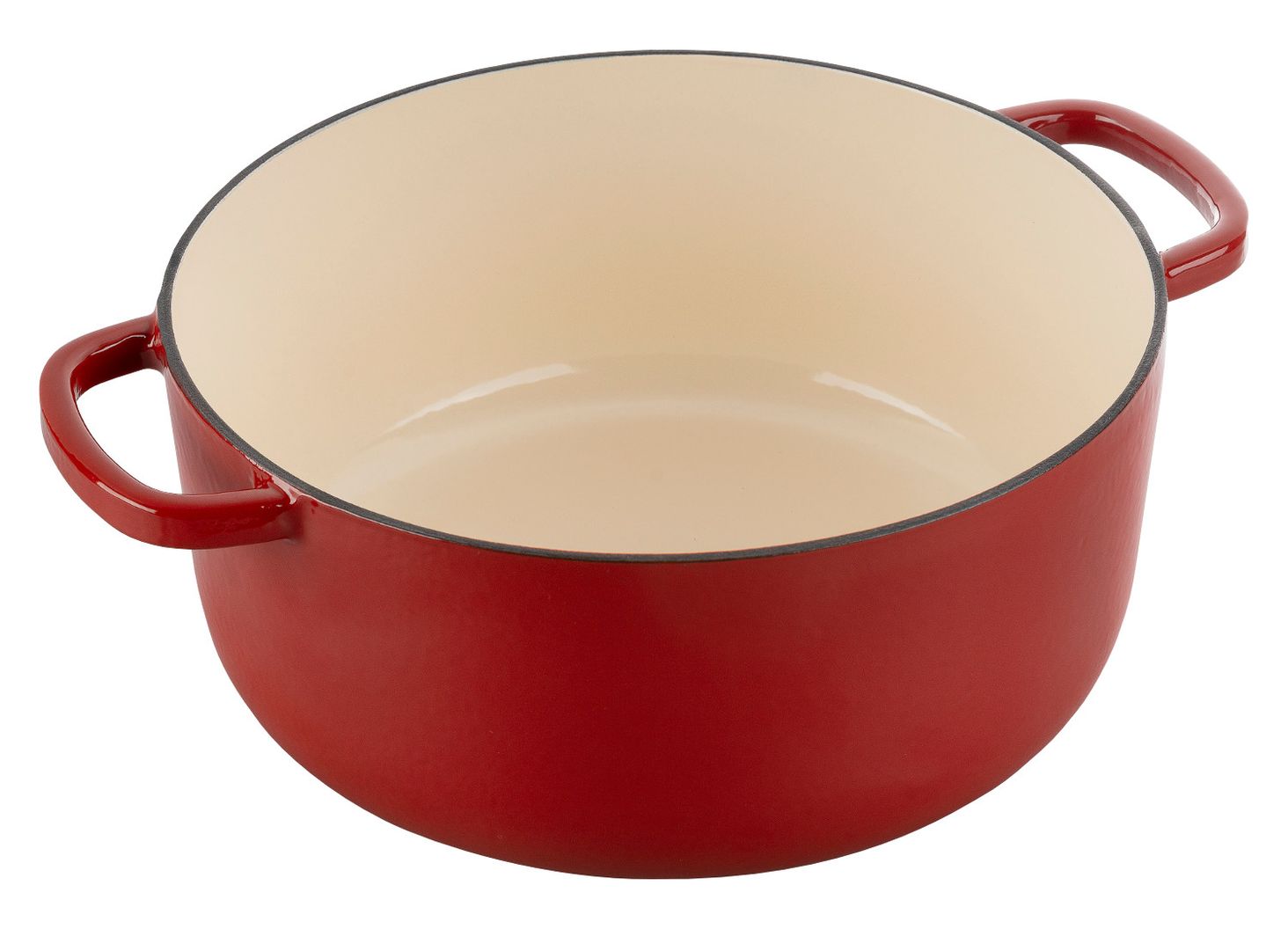 Каструля чавунна кругла, червона, діаметр. 26 см і місткість 5,5 л. Добре зберігає тепло і рівномірно розподіляє тепло. Комплектується кришкою зі спеціальною структурою. Покритий емаллю.