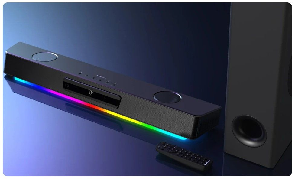 Саундбар також оснащено двома вбудованими мікрофонами, якщо ви хочете швидко перейти до кімнати чату Discord зі своєю командою або навіть до онлайн-зустрічей.
