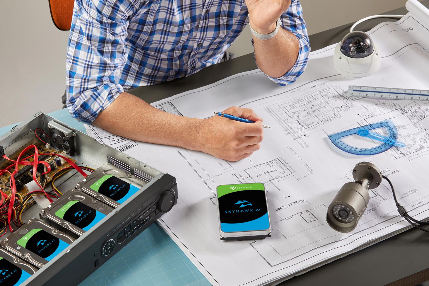 Накопичувач SkyHawk AI, розроблений з урахуванням відеоаналітики штучного інтелекту, підтримує до 64 HD-камер і 32 додаткові потоки штучного інтелекту, водночас пропонуючи ємність до 18 ТБ. Він гарантує нульову втрату кадрів завдяки програмному забезпеченню ImagePerfect AI і може похвалитися робочим навантаженням корпоративного класу 550 ТБ/рік для високої надійності.