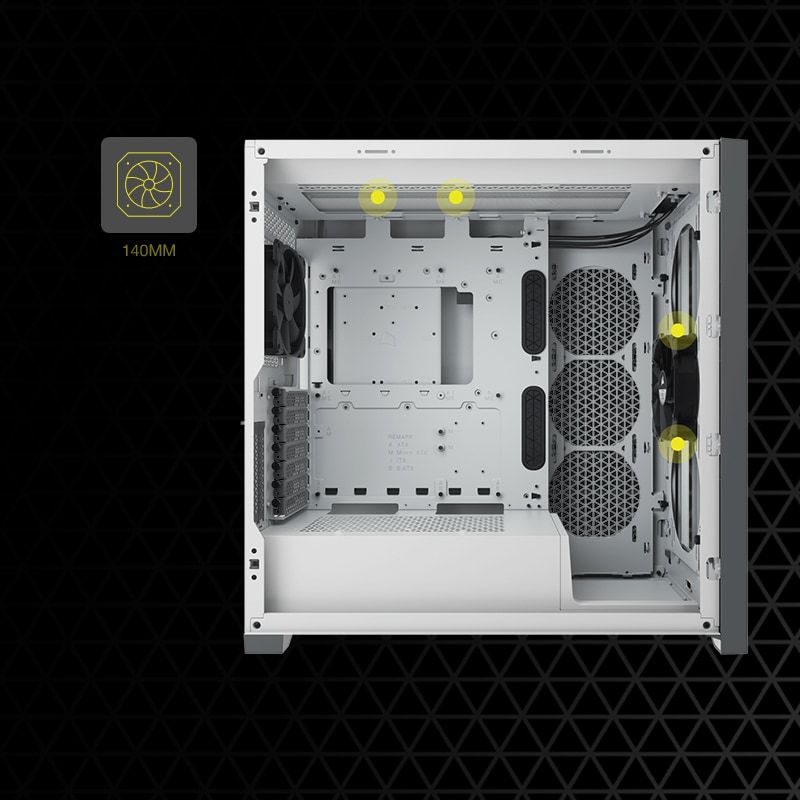 Максимальний потенціал охолодження: просторий інтер’єр вміщує до 10 120-мм вентиляторів охолодження або 4 140-мм вентилятори разом із кількома радіаторами, включно з одним спереду — розміром 360 мм і одним угорі — розміром 360 мм у режимі штовхання/потягування .