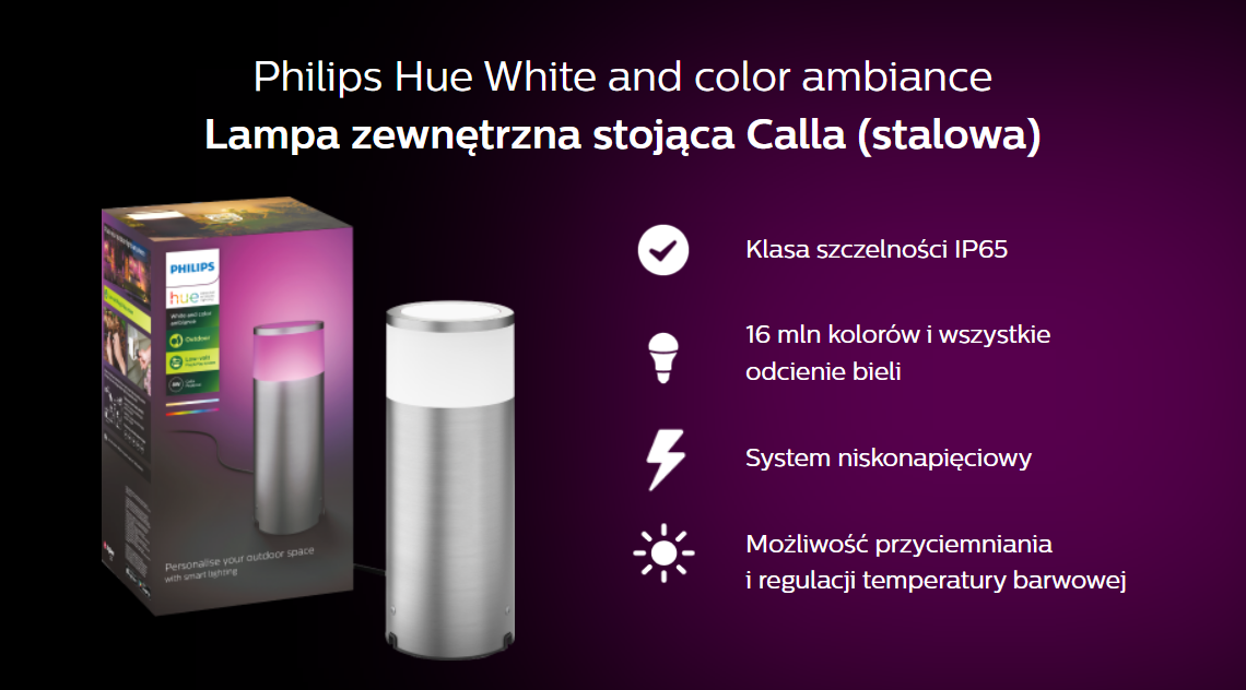 Вміст комплекту: 1 зовнішній стоячий світильник Philips Hue White і color ambiance Calla (сталь), 1 зовнішній кабель-подовжувач 2,5 м, 1 штифт для вставлення лампи в землю, 1 роз’єм T