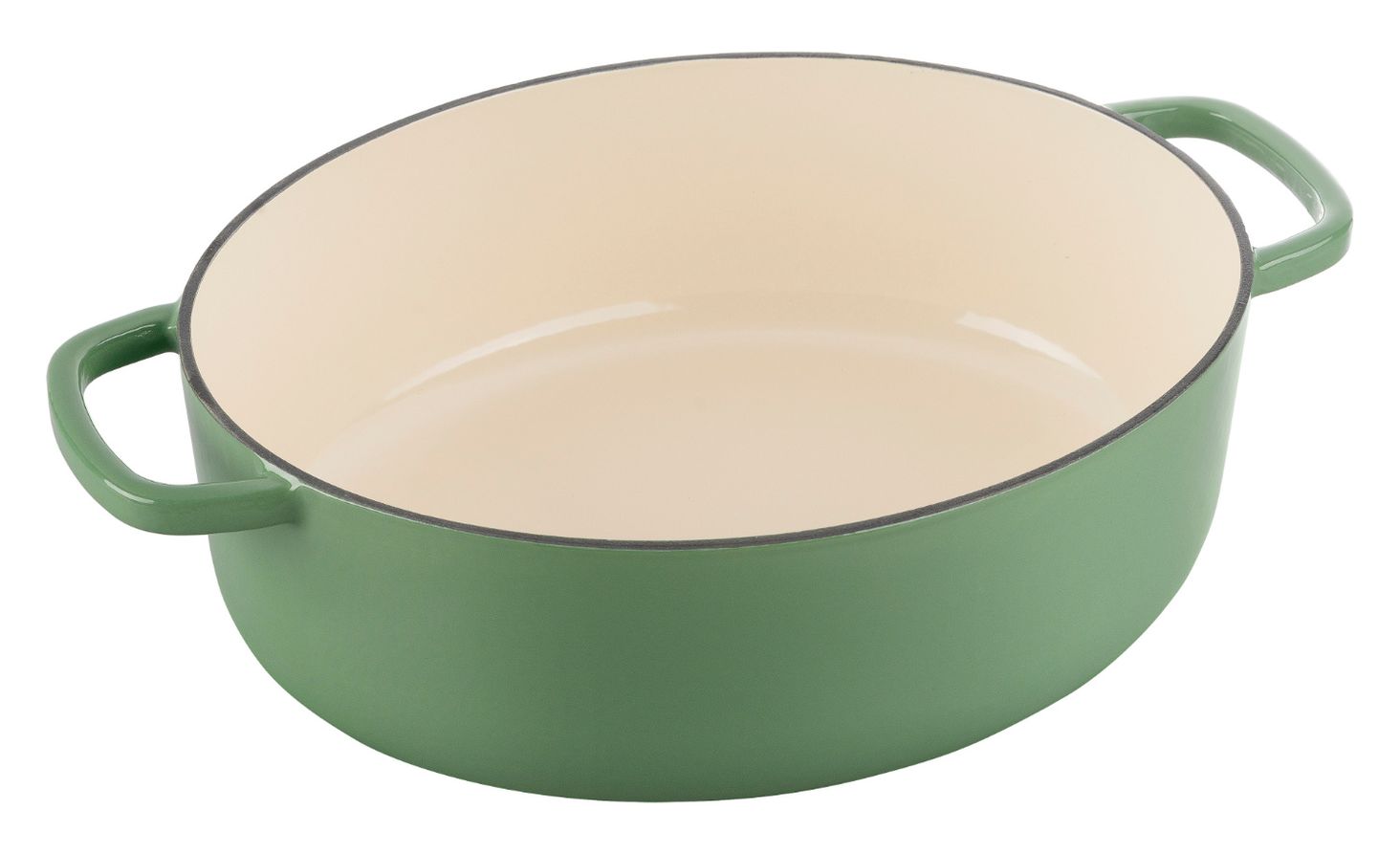 Каструля чавунна овальна, зеленого кольору та місткості. 4,5 л. Добре зберігає тепло і рівномірно розподіляє тепло. Комплектується кришкою зі спеціальною структурою. Покритий емаллю.