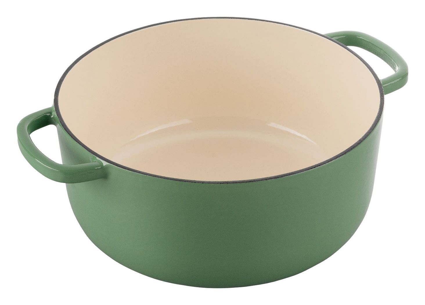 Каструля чавунна кругла, зелена, діаметр. 28 см і місткість 7 л. Добре зберігає тепло і рівномірно розподіляє тепло. Комплектується кришкою зі спеціальною структурою. Покритий емаллю.