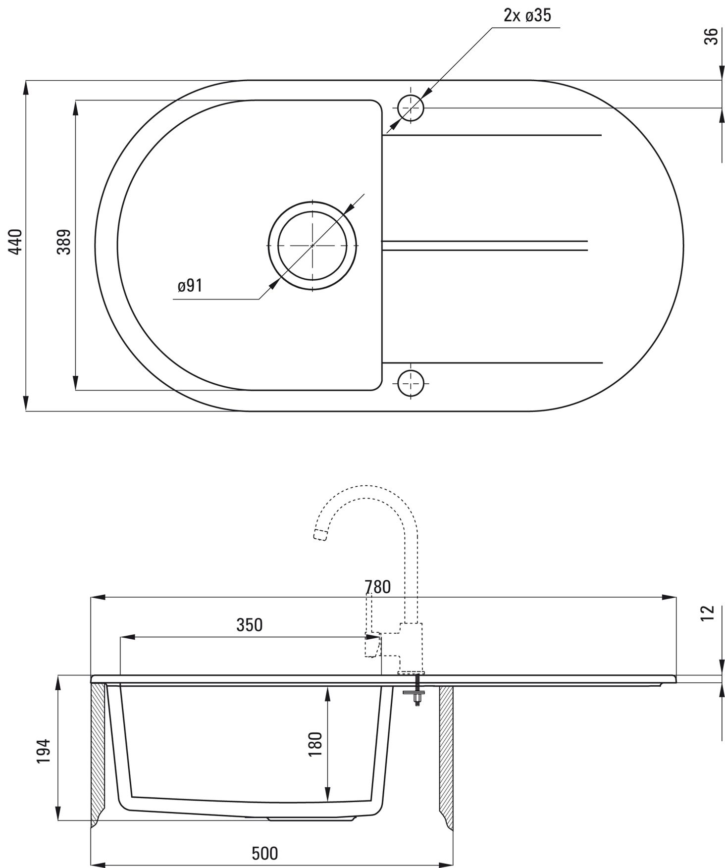 Довжина: 780 мм. Ширина: 440 мм. Глибина чаші: 180 мм. Для шафи: 500 мм. Модель раковини: 1 чаша. Злив: 3,5 дюйма