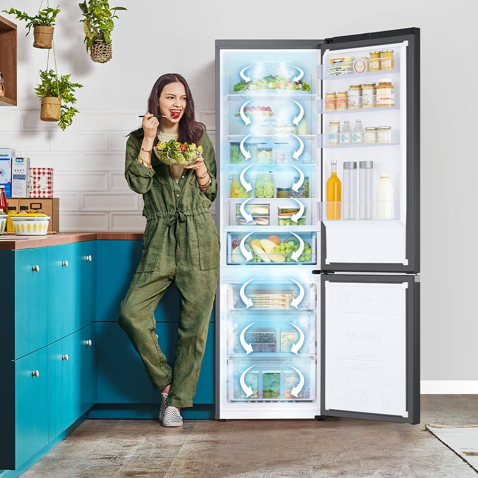 Система всестороннього охолодження м’яко та рівномірно розподіляє холодне повітря по приладу, забезпечуючи більш ефективне та легше охолодження там, де цього потребує їжа. Точно, швидко та в кожному куточку вашого холодильника.