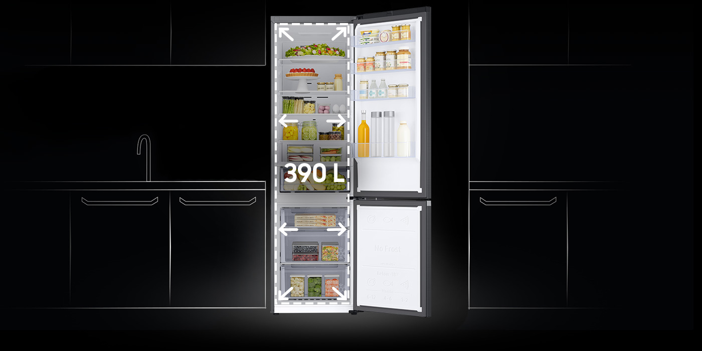 Технологія SpaceMax™ дозволила розширити корисний простір без порушення зовнішніх розмірів пристрою. Унікальна та високоефективна система ізоляції зробила стінки холодильника тоншими, а здобутий простір було відведено під їжу та напої. У моделі RB38C600EB1 ви маєте 390 л об’єму: 276 л у холодильнику та 114 л у морозильній.