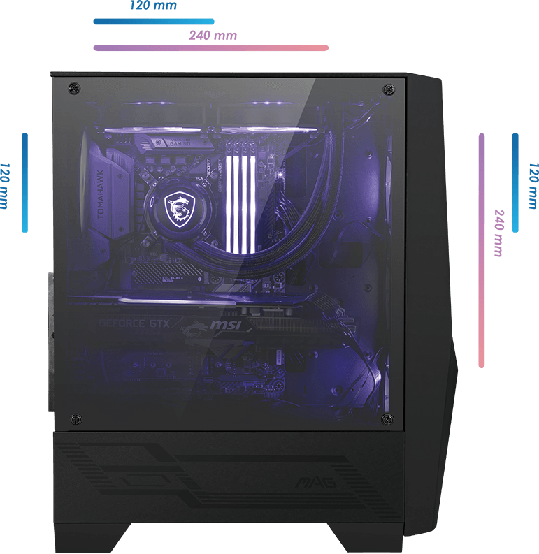 Система з двох 120-мм вентиляторів, розташованих вертикально спереду, забезпечує рівномірне всмоктування повітря по всій передній поверхні корпусу. Це створює надлишковий тиск у корпусі, і тепле повітря, що піднімається вгору, завжди видувається із задньої та верхньої частини кожного корпусу серії MAG Forge 100.