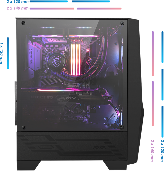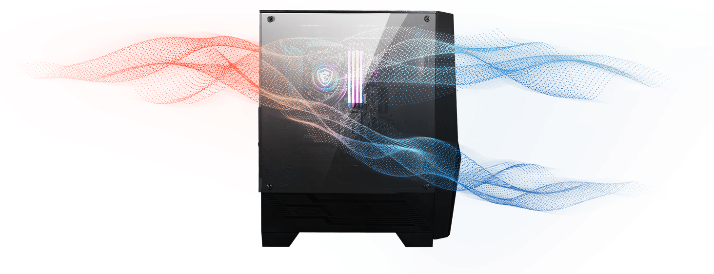 Система з двох 120-мм вентиляторів, розташованих вертикально спереду, забезпечує рівномірне всмоктування повітря по всій передній поверхні корпусу. Це створює надлишковий тиск у корпусі, і тепле повітря, що піднімається вгору, завжди видувається із задньої та верхньої частини кожного корпусу серії MAG Forge 100.