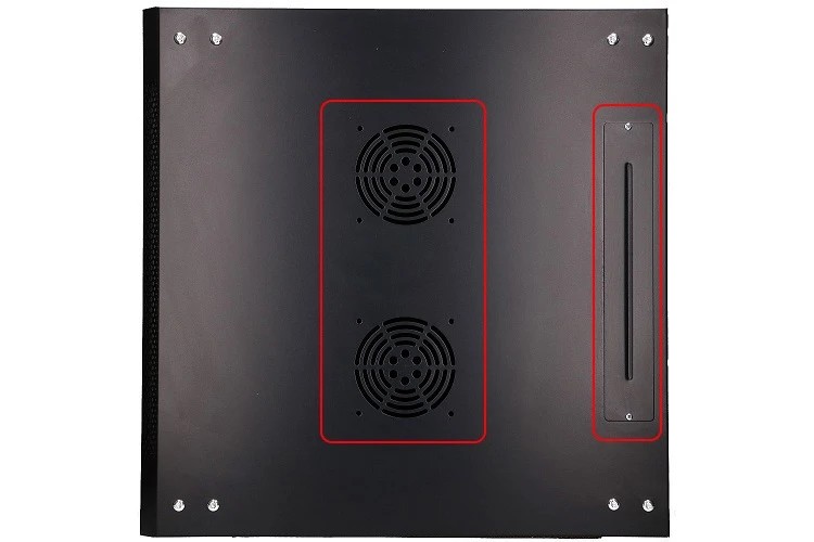 У верхній частині корпусу є два місця, підготовлені для встановлення вентиляторів, які сприяють кращому охолодженню пристроїв. Крім того, є додатковий отвір, через який можна витягнути кабелі.
