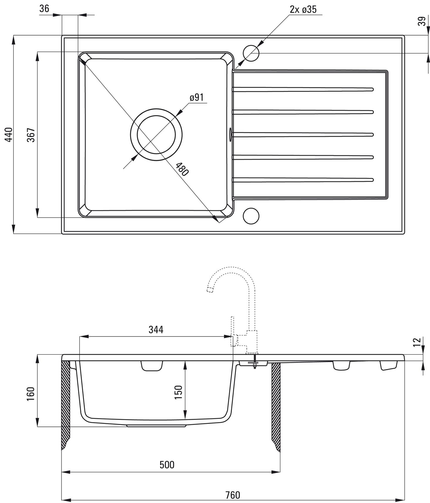Довжина: 760 мм. Ширина: 440 мм. Глибина чаші: 150 мм. До шафи: 500 мм. Злив: 3,5 дюйма. Модель раковини: 1 чаша