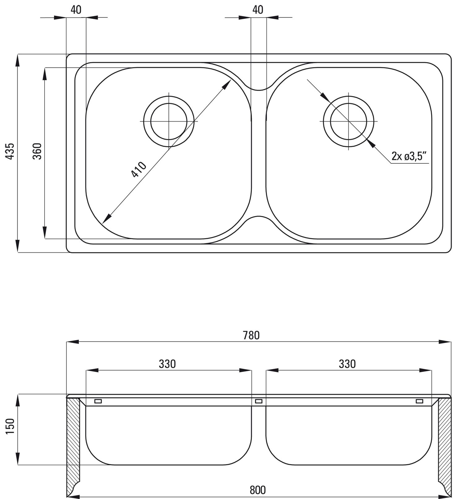 Довжина: 780 мм. Ширина: 435 мм. Глибина чаші: 150 мм. До шафи: 800 мм. Злив: 3,5 дюйма. Модель мийки: 2 чаші. Товщина сталі: 700 мкм.