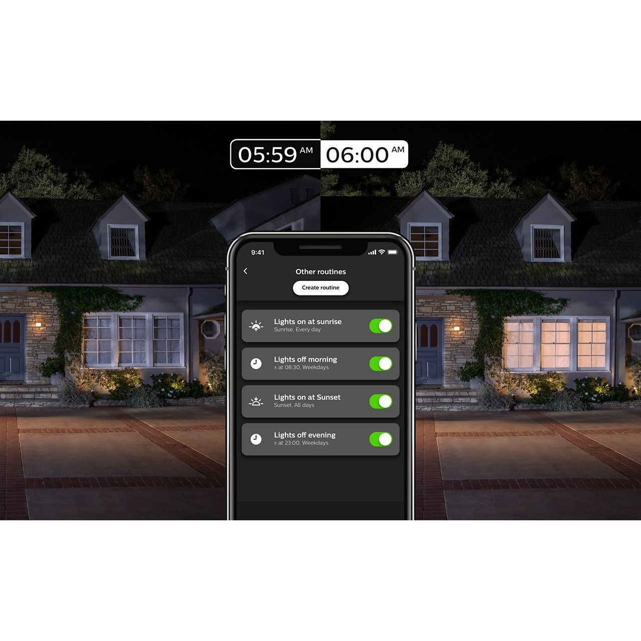 Проводьте довші вечори надворі, закінчуйте роботу на подвір’ї або просто виносьте сміття в темряві. Ваші освітлювальні прилади Philips Hue вмикатимуться автоматично відповідно до ваших розкладів або сходу та заходу сонця. Звичайно, ви також можете вимкнути або приглушити освітлення таким чином. Ви більше ніколи не будете хвилюватися про те, що світло залишиться ввімкненим.