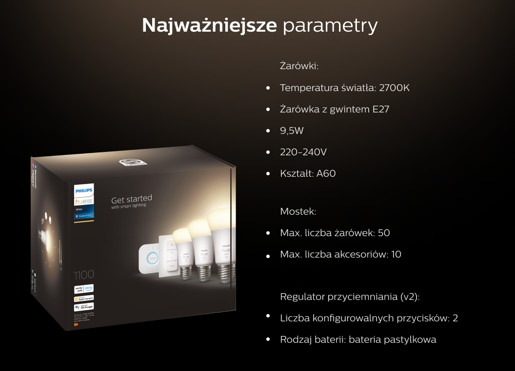 3x Philips Hue White A60 E27 1100lm, 1x Hue Bridge, 1x Dimmer Controller (v2), 1x мережевий кабель Ethernet, 1x блок живлення