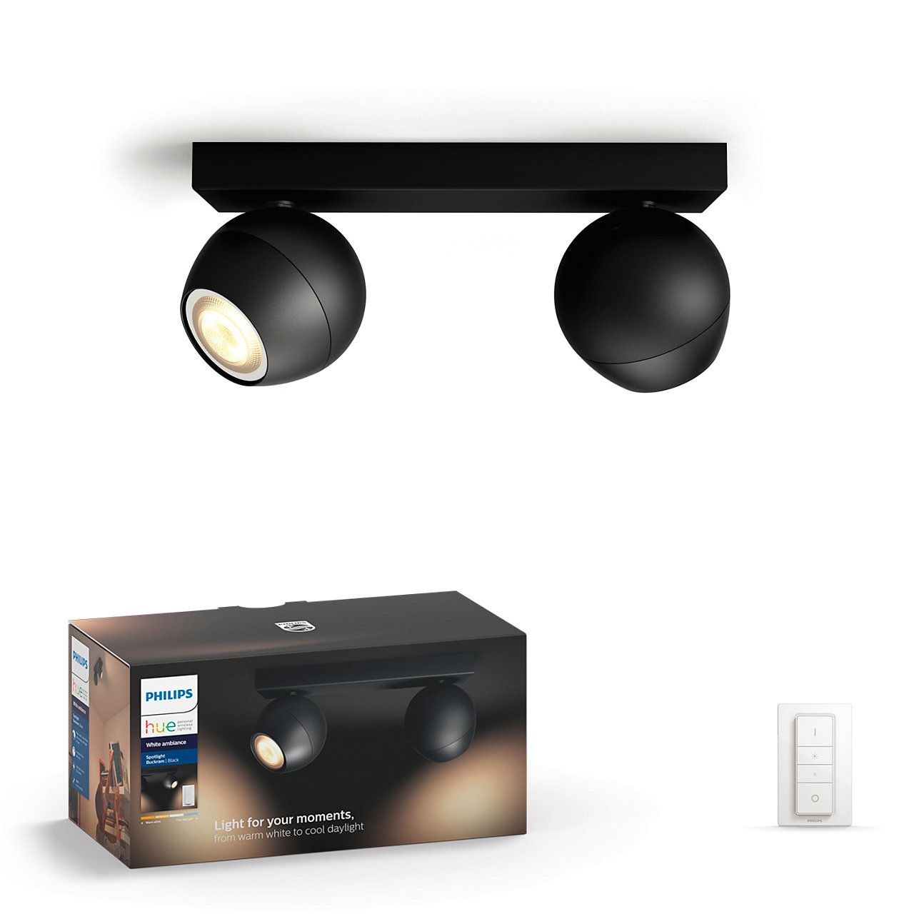 Прожектори Buckram працюють із системою Philips Hue. Вони оснащені бездротовим диммером і світлодіодними джерелами світла GU10, які забезпечують біле навколишнє світло, щоб допомогти вам розслабитися, почитати, зосередитися та зарядитися енергією. Насолоджуйтеся природним білим світлом, яке адаптується до вашої щоденної діяльності.