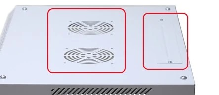 На стелі шафи є 2 спеціальні місця для встановлення вентиляторів, які призначені для покращення циркуляції повітря та зниження температури приладів. Крім того, є додатковий кабельний вхід для витягування кабелів, що полегшує керування кабелями.