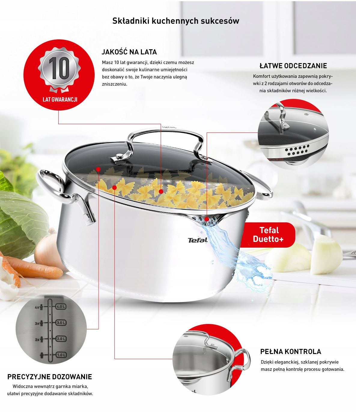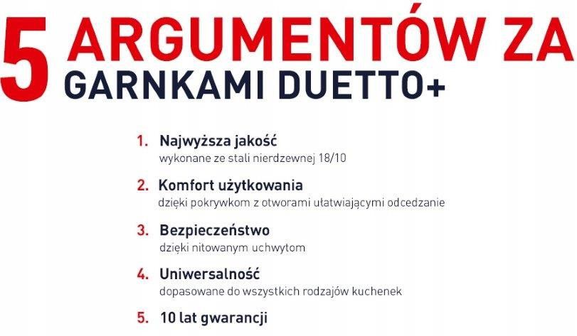 Duetto+ — це лінійка каструль, які допоможуть вам готувати їжу швидше та проводити менше часу на кухні. Каструлі виготовлені з високоякісної нержавіючої сталі 18/10 і на них поширюється гарантія 10 років. Два типи отворів у кришках розроблені для легкого зливання як більших інгредієнтів, таких як макарони, так і менших інгредієнтів, таких як рис. Все це для того, щоб полегшити приготування їжі та зменшити кількість миття. Мірні чашки, видимі всередині горщиків, полегшують точне додавання інгредієнтів, гарантуючи ідеальні результати. Суцільні клепані ручки забезпечують безпечне використання посуду і захищають від надмірного нагрівання ручок, а скляні кришки полегшують контроль приготування. Каструлі Duetto+ можна використовувати на всіх типах плит, включаючи індукційні. Елегантний дизайн робить Duetto+ стильним акцентом на вашій кухні!