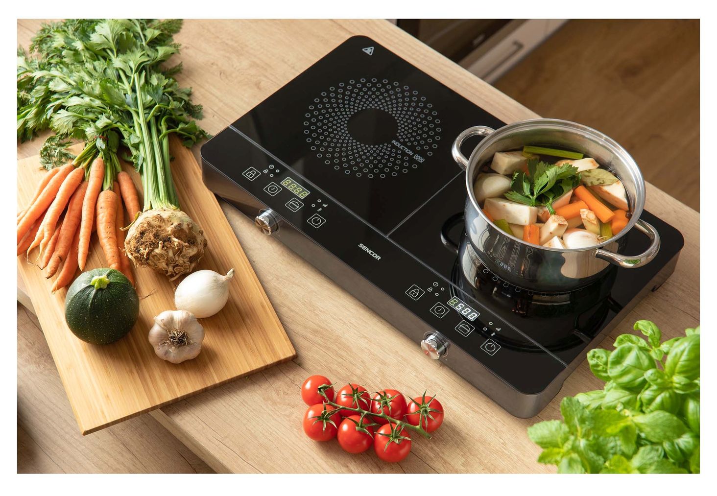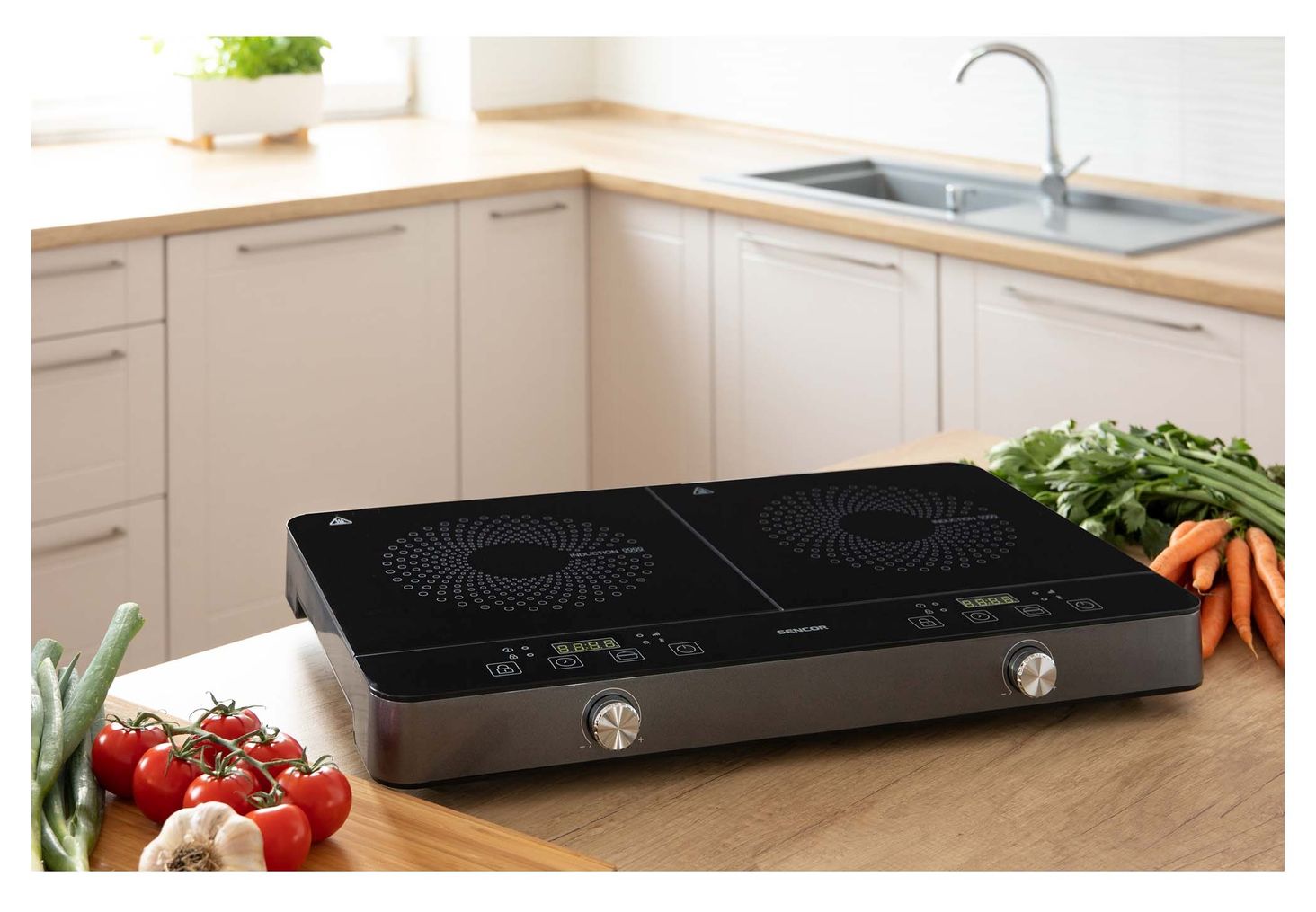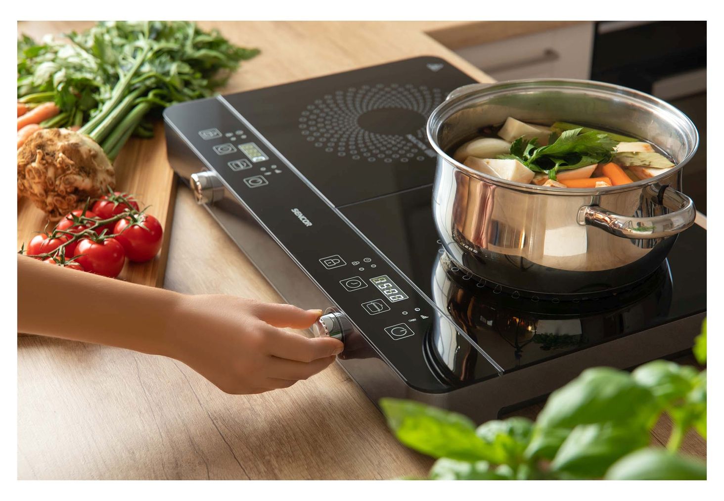 Сенсорне керування в поєднанні з класичним поворотним регулятором. Управління процесом за допомогою мікропроцесора. Автоматичне визначення індукційних посудин (з магнітним дном). РК-дисплей для читання з червоним підсвічуванням Регулювання температури в діапазоні до 240 °C 10 попередньо встановлених рівнів нагріву в діапазоні 200 - 2000 Вт Таймер відкладеного вимкнення з діапазоном 1 - 180 хвилин. можливість налаштування кроків через 1 хвилину. Кнопка ON/OFF використовується для ввімкнення пристрою або переходу в режим очікування. Протиковзкі ніжки