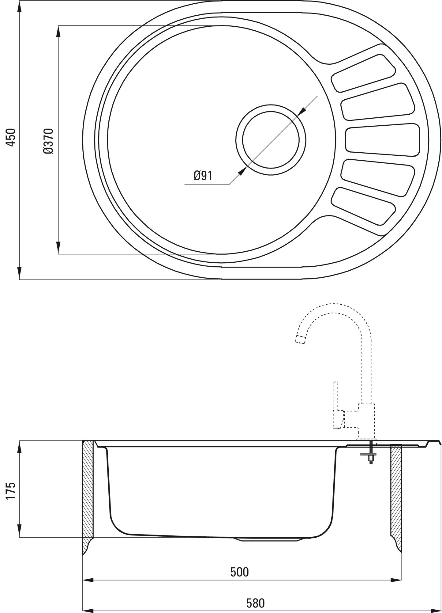 Довжина: 580 мм. Ширина: 450 мм. Глибина чаші: 175 мм. До шафи: 500 мм. Злив: 3,5 дюйма. Модель мийки: 1 чаша. Товщина сталі: 600 мкм