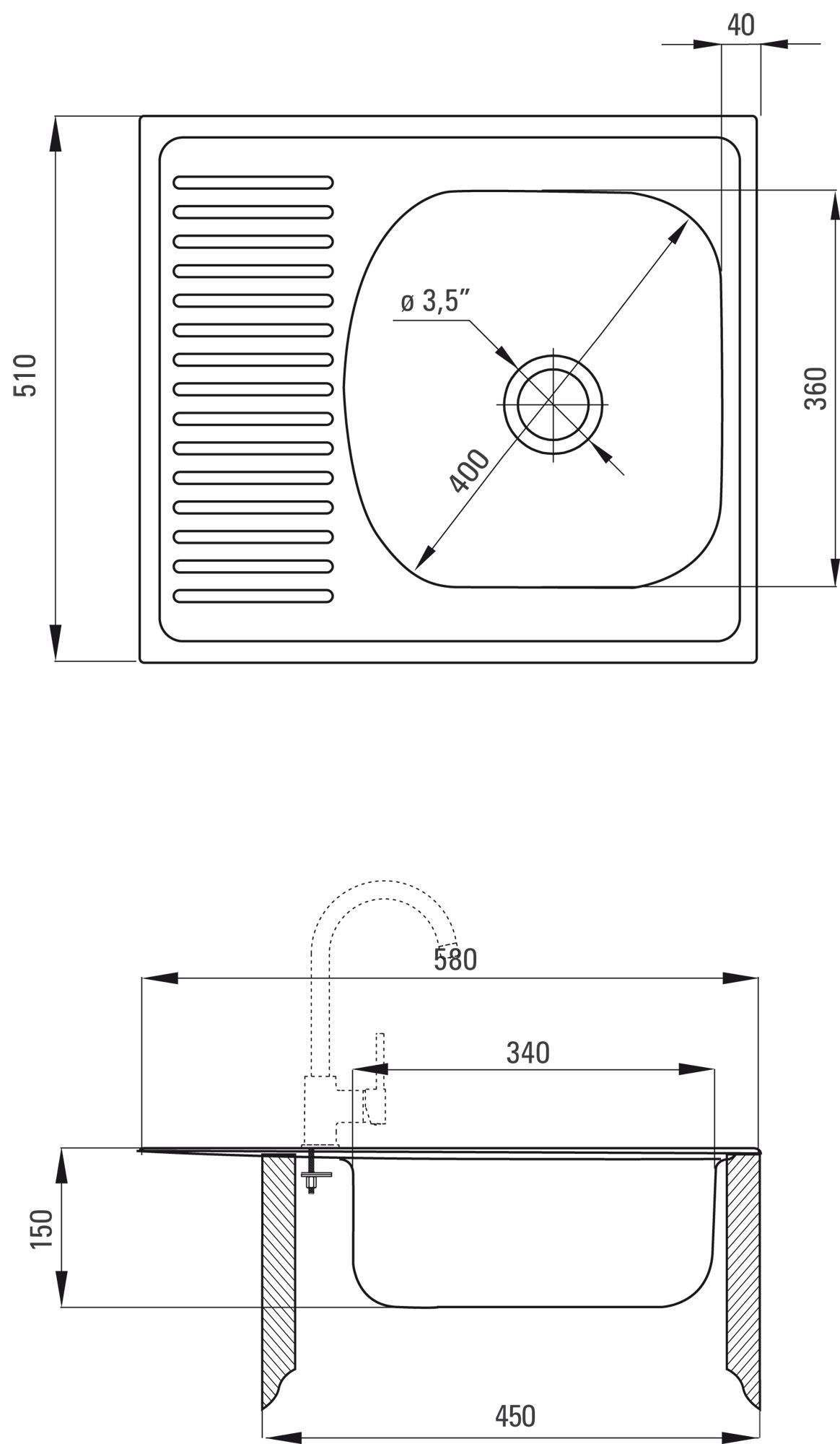 Довжина: 580 мм. Ширина: 510 мм. Глибина чаші: 150 мм. До шафи: 450 мм. Злив: 3,5 дюйма. Модель мийки: 1 чаша. Товщина сталі: 600 мкм