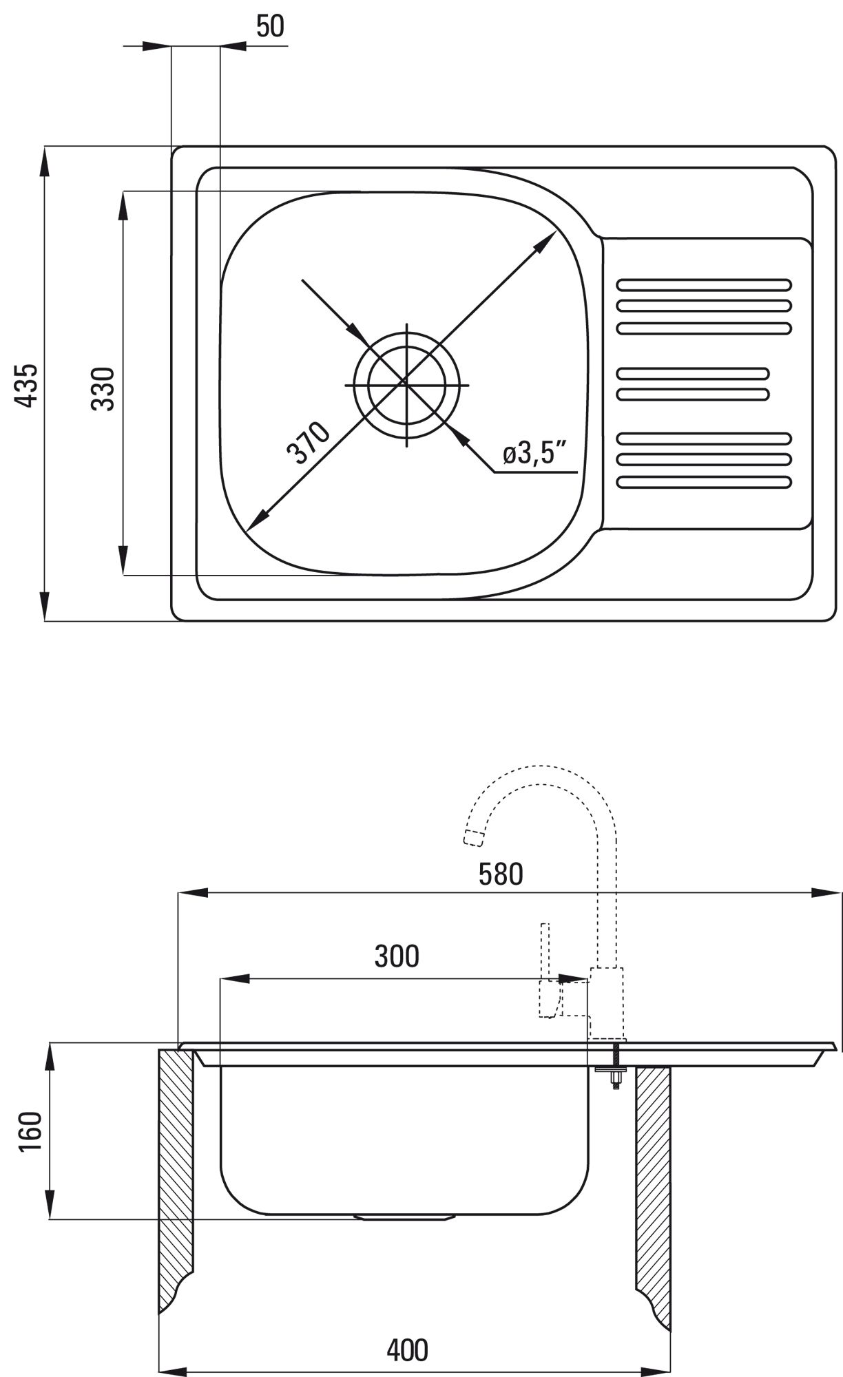 Довжина: 580 мм. Ширина: 435 мм. Глибина чаші: 160 мм. До шафи: 400 мм. Злив: 3,5 дюйма. Модель мийки: 1 чаша. Товщина сталі: 700 мкм