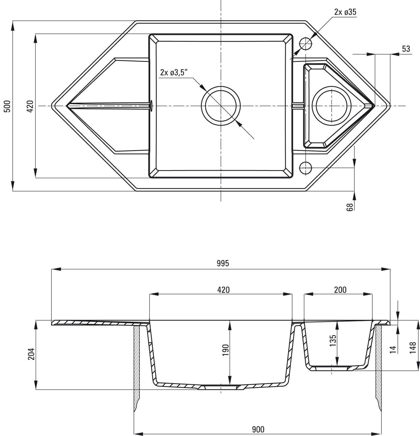Довжина: 995 мм. Ширина: 500 мм. Глибина: 190 мм. Для шафи: 900 мм. Злив: 3,5 дюйма. Модель мийки: 1,5 чаші. Автоматична заглушка: Так