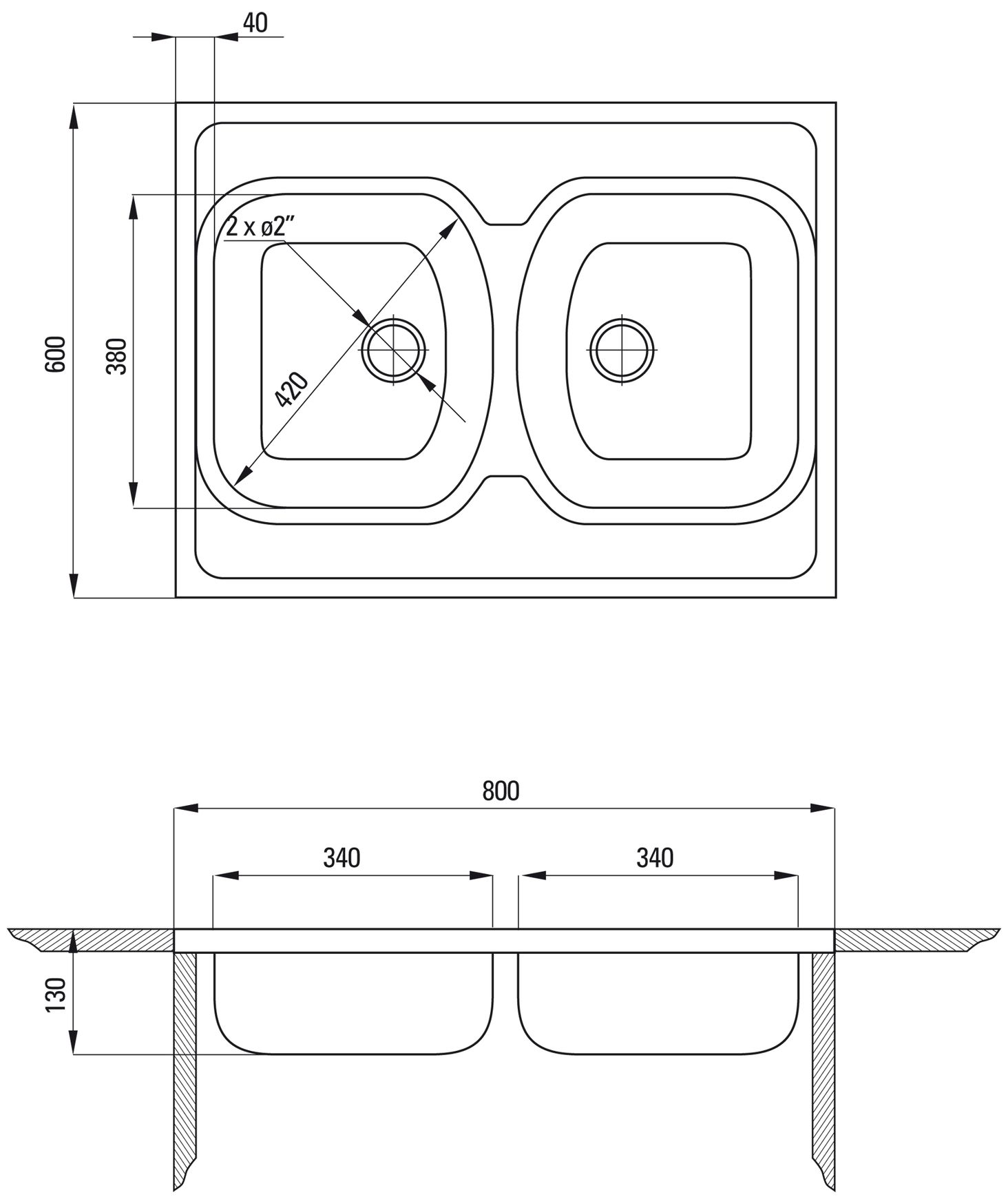 Довжина: 800 мм. Ширина: 600 мм. Глибина чаші: 130 мм. Для шафи: 800 мм. Злив: 2 дюйми. Модель мийки: 2 чаші. Товщина сталі: 500 мкм.