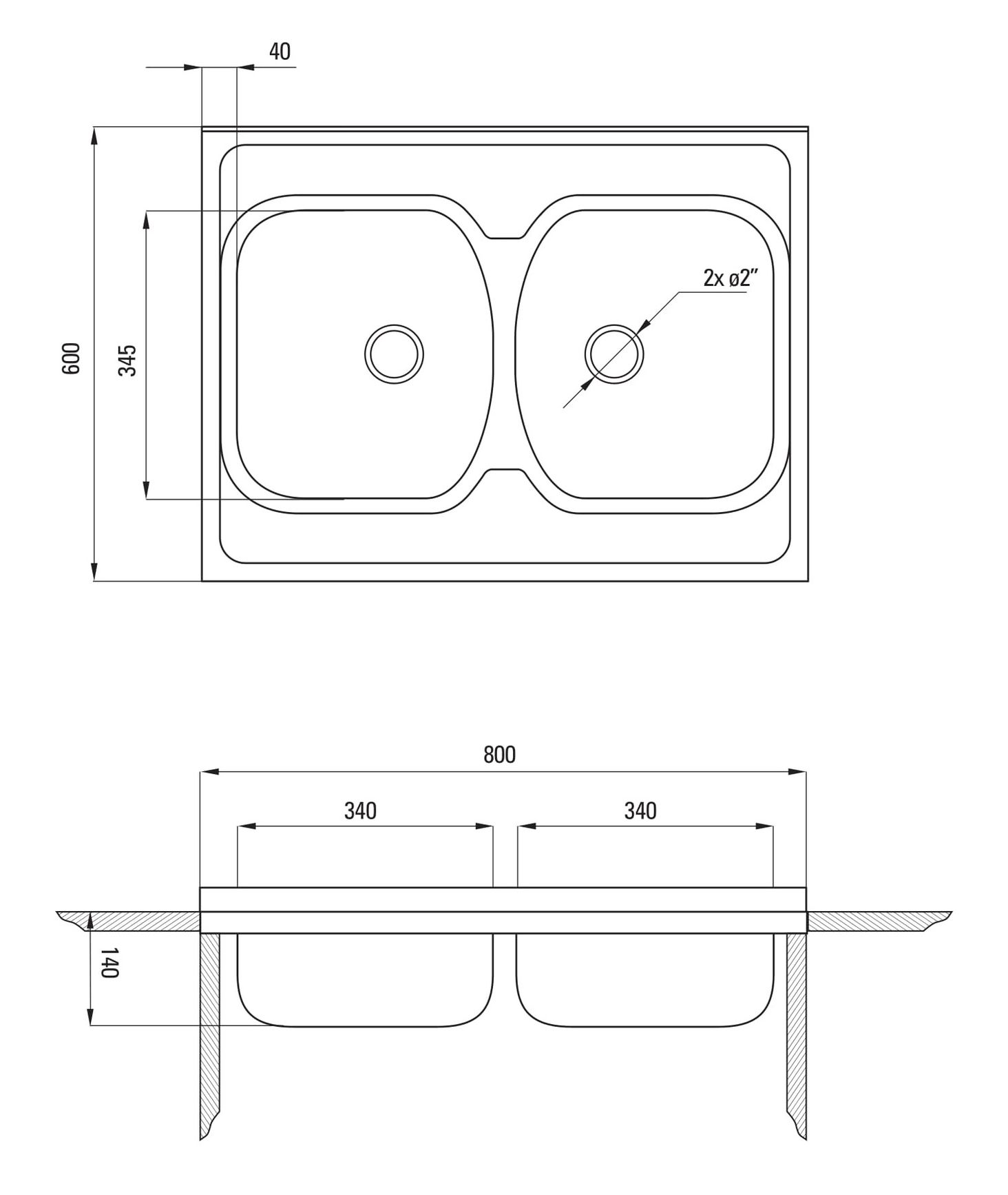 Довжина: 800 мм. Ширина: 600 мм. Глибина: 140 мм. Для шафи: 800 мм. Злив: 2 дюйми. Модель мийки: 2 чаші. Товщина сталі: 500 мкм.