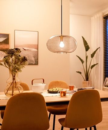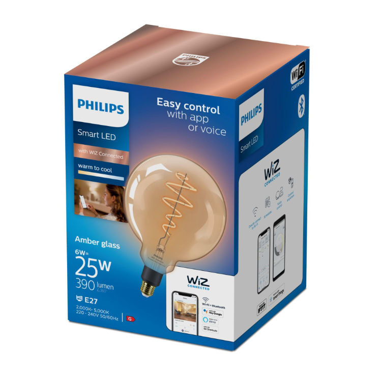 Надайте своїм кімнатам виразного вигляду за допомогою світлодіодної розумної лампочки Philips WiZ — великої форми кулі з бурштиновим світінням і видимою спіраллю, яка може світитися теплим або холодним білим світлом. Ви можете керувати ним за допомогою програми WiZ або голосом через існуючу мережу Wi-Fi.