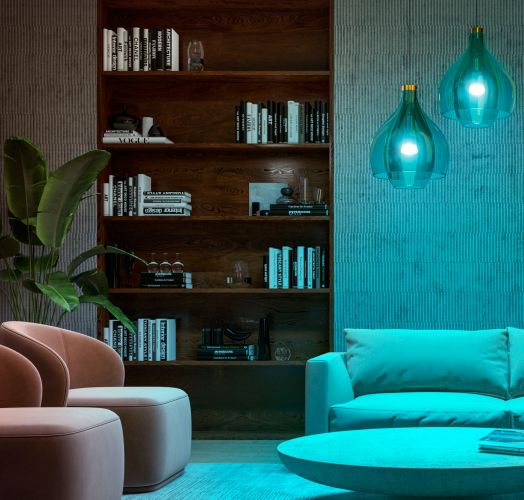 Потужна кольорова лампочка освітлює великі кімнати яскравим барвистим світлом.