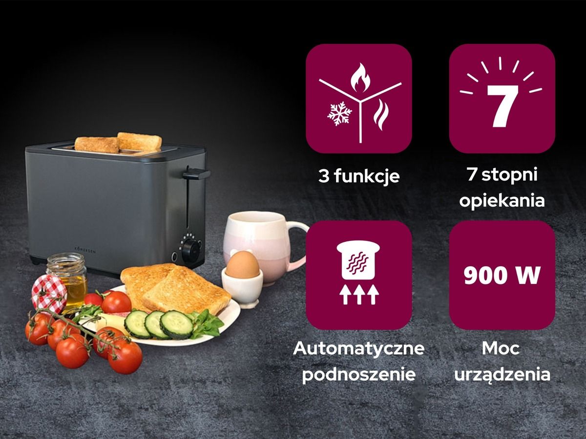Тостер Kohersen® Modern Matt не лише має стильний зовнішній вигляд, але й забезпечує довговічність. Його потужність 900 Вт гарантує швидке та ефективне підсмажування._x000D_ Сніданок, вечеря або перекус протягом дня - усі ці страви набудуть смаку та хрускоту завдяки тостеру Kohersen®. Цей стильний прилад перетворить звичайні бутерброди в ароматні та хрусткі ласощі. Золотий тост — основа незвичайних композицій інгредієнтів і смакових поєднань.