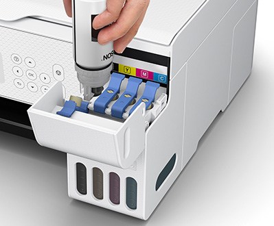 Принтери EcoTank забезпечують безпроблемний друк вдома - Контейнери для_x000D_ Чорнило великої ємності можна заправляти без безладу та пляшки_x000D_ Замок розроблено таким чином, що можна використовувати певний колір чорнила_x000D_ слід було наливати лише у відповідну ємність. Індикатор рівня чорнила_x000D_ розташований на передній панелі пристрою, чітко інформуючи користувача, коли його потрібно поповнити.