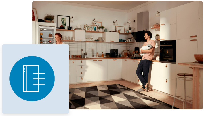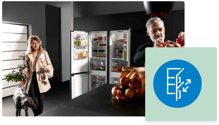 На деяких кухнях прилади розміщені в незвичних місцях. Дверцята SmoothFit™ відкриваються врівень під кутом 90 градусів, що означає, що холодильник можна легко поставити в кутку кімнати або прямо біля стіни - без шкоди для зручності використання. Ящики також повністю висуваються!