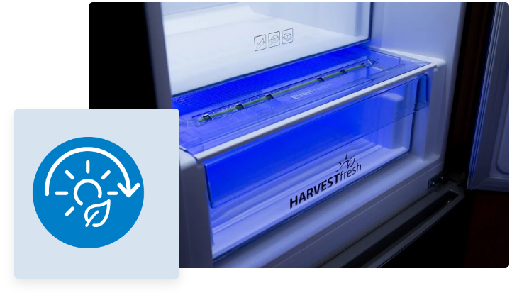 Це інноваційна 3-колірна технологія, яка дозволяє довше зберігати вітаміни А та С в овочах і фруктах, що зберігаються. Завдяки цьому наші продукти довше залишатимуться свіжими. У спеціальному ящику HarvestFresh 24-годинний цикл сонця імітується за допомогою синього, зеленого та червоного світла.