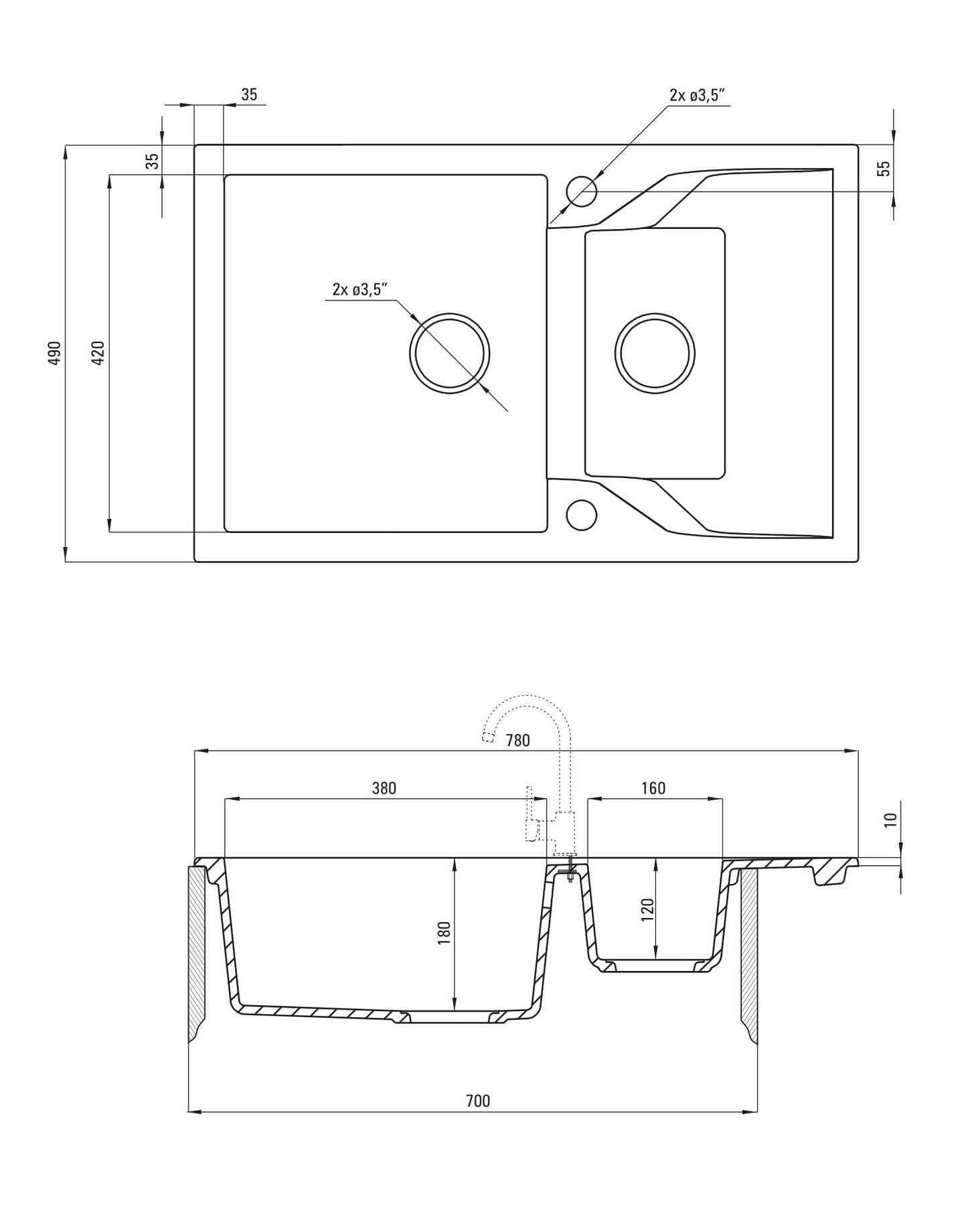 Довжина: 780 мм. Ширина: 490 мм. Глибина: 190 мм. Для шафи: 700 мм. Злив: 3,5 дюйма. Модель мийки: 1,5 чаші. Автоматична заглушка: Так