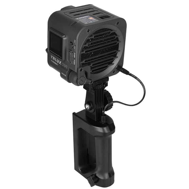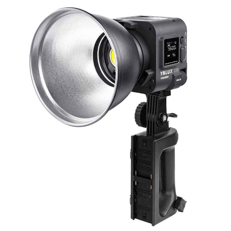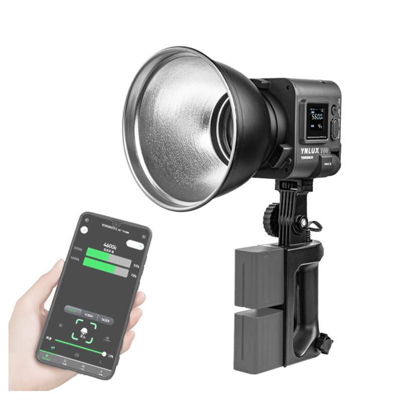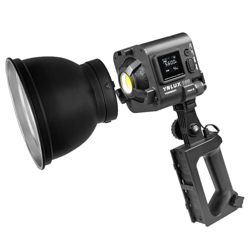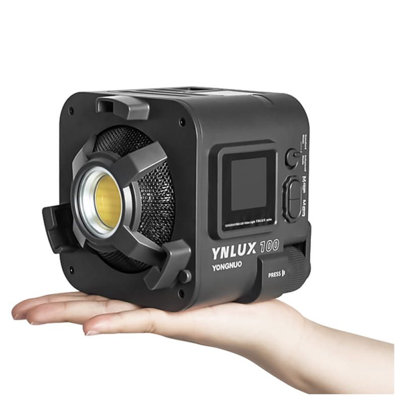 Компактна світлодіодна лампа Yongnuo YNLUX100 з регульованою потужністю, колірною температурою від 3200 до 5600 К і 12 тематичними програмами. Завдяки унікальному дизайну з розмірами 12 × 12 × 12,5 см, знімній ручці та кріпленню Bowens, це корисний інструмент на невеликих знімальних майданчиках. Споживана потужність 100 Вт. У комплект входить блок живлення, ручка, абажур і валіза.