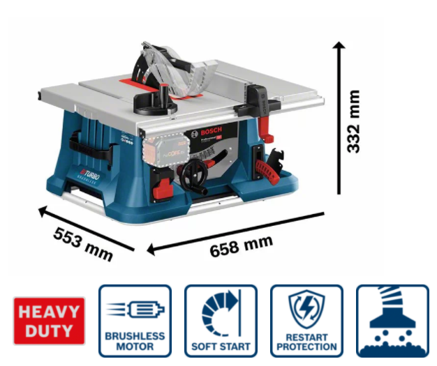 Напруга батареї: 18 В Пильний диск Ø: 216 мм Розміри столу: 658 х 553 мм Швидкість холостого ходу: 4500 об/хв Висота зрізу: 70 мм Вага: 21,6 кг Максимальна потужність різання з правого боку: 635 мм