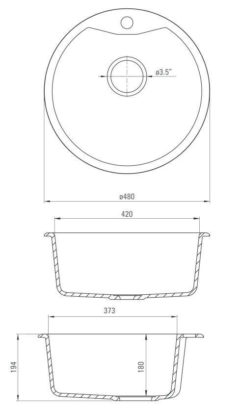 Довжина: 480 мм. Ширина: 480 мм. Глибина чаші: 180 мм. Для шафи: 500 мм. Злив: 3,5 дюйма. Модель раковини: кругла