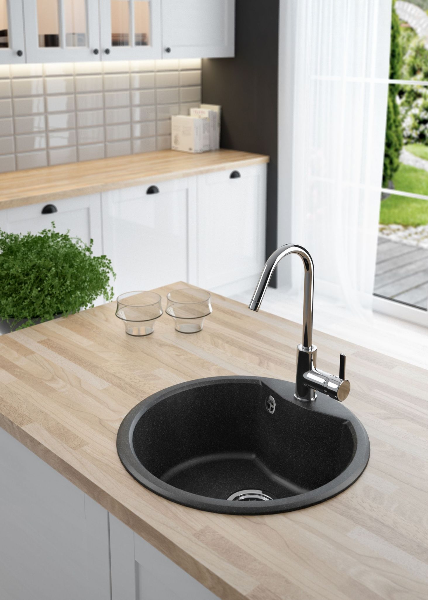 Граніт Deante відштовхує частинки води, тому довше залишається чистим. Кольорові соки, кава та чай швидко розтікаються по поверхні, не забарвлюючи її. Це особливість матеріалу, а не верхнього покриття, а значить, воно не зітреться і не потребуватиме поповнення.
