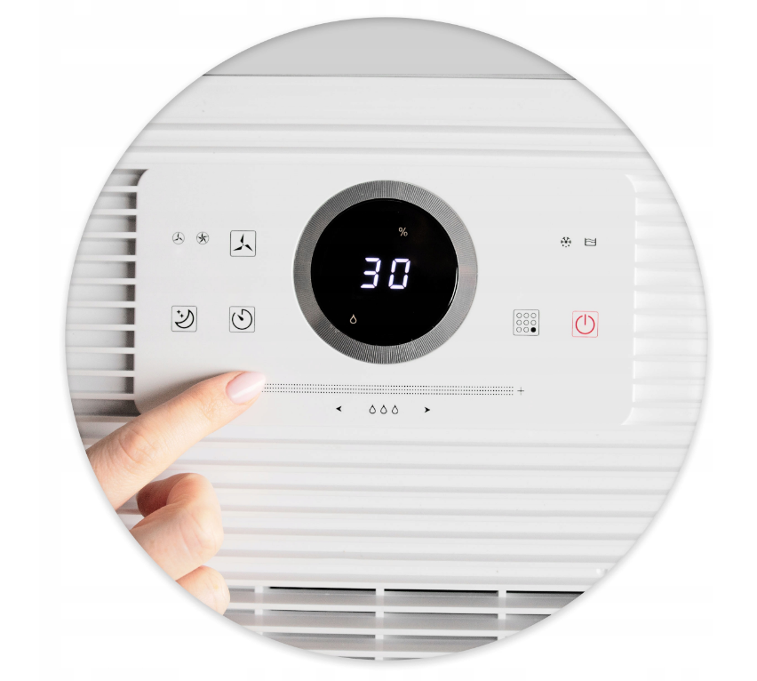 Сучасна сенсорна панель управління з системою soft touch, розташована у верхній частині осушувача, забезпечить найвищий комфорт використання. Завдяки йому можна регулювати всі робочі параметри. На дисплеї відображається поточна вологість у приміщенні та вибрані функції. Ви також можете легко ввімкнути нічний режим, який вимкне панель, дозволяючи комфортно спати або просто економити енергію.