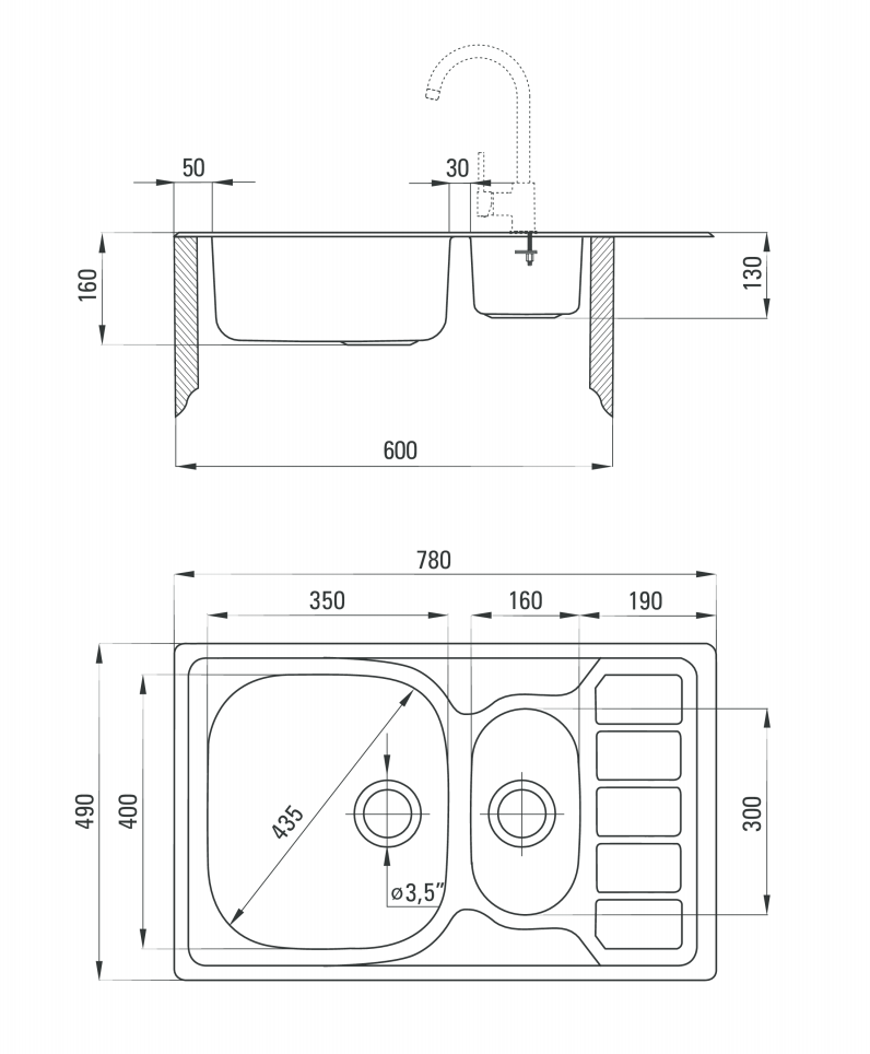 Довжина: 780 мм Ширина: 490 мм Глибина чаші: 160 мм До шафи: 600 мм Злив: 3,5 дюйма Модель мийки: 1,5 чаші Товщина сталі: 600 мкм