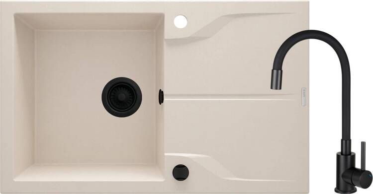 Гранітна мийка зі змішувачем створює повноцінний кухонний гарнітур. Він виготовлений із міцного натурального граніту, який стійкий не лише до високої температури та її коливань, а й до ударів та зміни кольору, відповідно до європейського стандарту PN-EN 1331