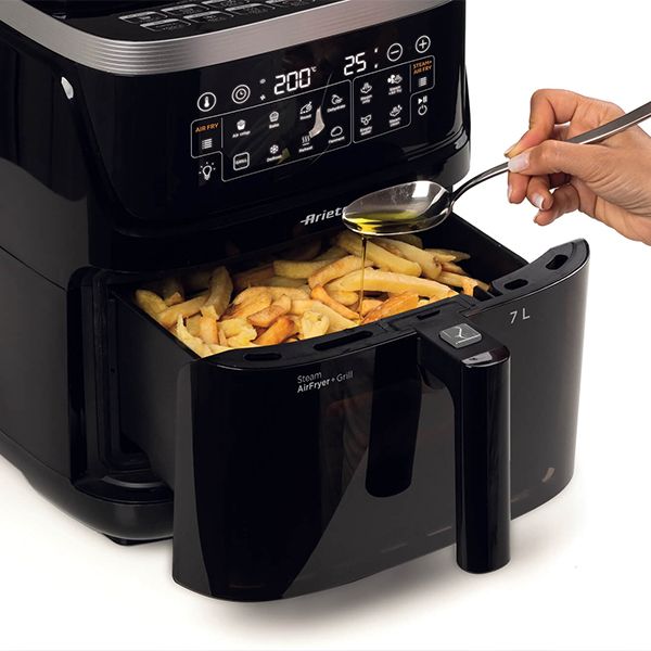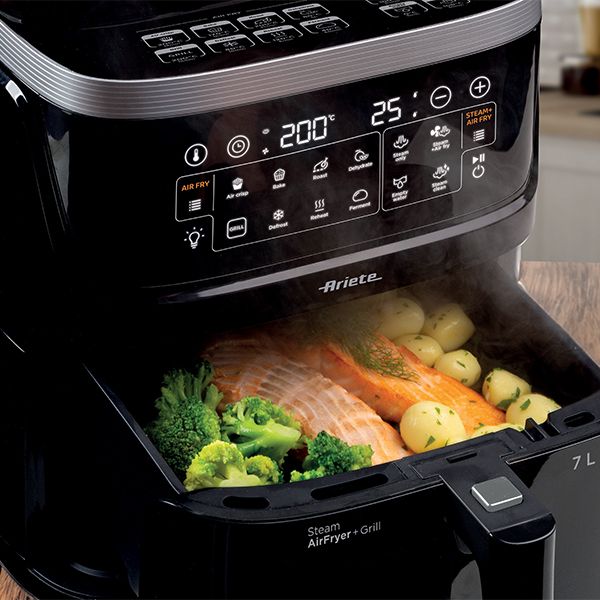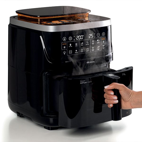 Відкрийте для себе фритюрницю Ariete 4636 Air Fryer & Steam без жиру, яка поєднує в собі функцію смаження гарячим повітрям із запіканням на пару, забезпечуючи стравам ідеальний баланс хрусткості та соковитості. Завдяки потужності 1700 Вт і вбудованому парогенератору потужністю 800 Вт цей прилад відкриває перед вами абсолютно нові кулінарні можливості. Оснащений 10 програмами, функцією Max Crisp, системою пароварки та Air Fryer, він дозволяє готувати різноманітні страви швидко, здорово та просто. Внутрішнє освітлення та прозора передня частина чаші дають повний контроль над процесом приготування, а велика ємність 7 літрів дозволяє готувати страви для всієї родини.