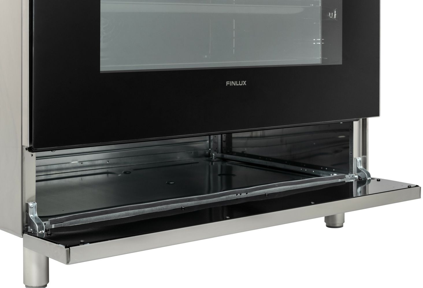 Практичні рішення Прямо під дверцятами духовки FINLUX FC994IWNI є вміло захований висувний ящик, у якому можна зберігати аксесуари та дека, невеликі каструлі чи сковорідки. Ще один сюрприз – можливість зняти внутрішнє скло духовки. Завдяки цьому скло можна легко мити. Внутрішню частину духовки також легко підтримувати в чистоті, оскільки вона покрита емаллю, яку легко мити, а телескопічні напрямні легко знімаються.